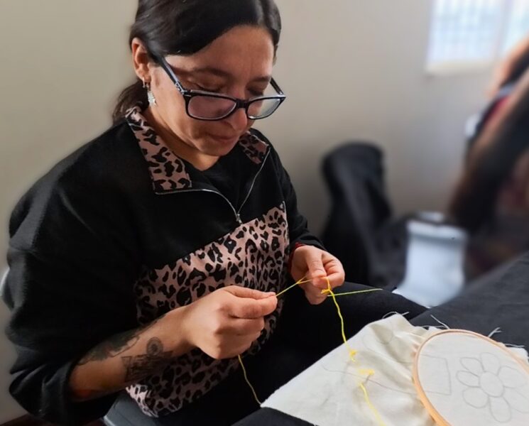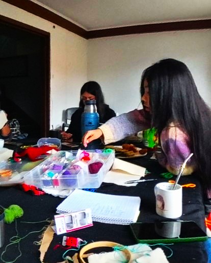 “Estamos bordando por la vida frente a la injusticias que hoy dia están ocurriendo con el caso de nuestra lamgen Julia Chuñil, en el caso del genocidio en Palestina. Reflexionar sobre lo que está pasando porque también es una forma de lucha, es una forma muy anticapitalista porque es mucho más lento a la rapidez que estamos acostumbrados en el diario vivir, así que es algo muy bonito. Recordando cosas de niñas, de hacer cosas que ya se están perdiendo, por lo que es una bonita forma de recordar y de pedir justicia por nuestra lamngen” señaló Genoveva Antinao, perteneciente a la fundación Mapu Kimün