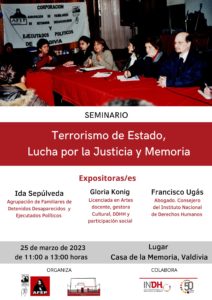 Finaliza serie de Seminarios Historia y Memoria Terrorismo de Estado, Lucha por Justicia y Memoria Este sábado 25 de marzo de 2023, desde las 11 de la mañana y hasta las 13 horas en la Casa de la Memoria de Valdivia, se realizará el seminario…